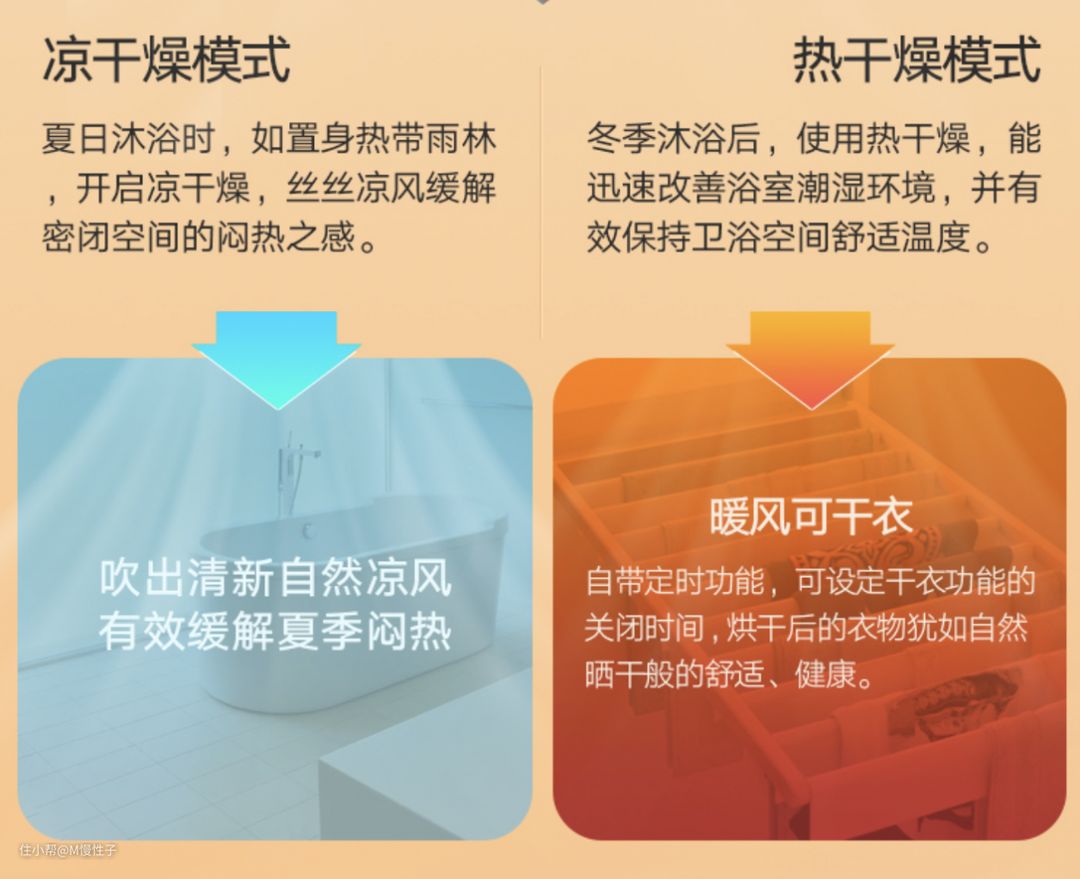 ▼第二就是热干燥与冷干燥,在冬季开启暖风对浴室内吹风的同时,还可以同时开启换气,保持室内氧气充足,让我们长时间的沐浴也不会感到闷。同时夏天开启晾干燥,不加热吹风同时加换气,让夏季沐浴更凉爽。吹风+换气同时进行是目前只有少数品牌掌握的新技术。