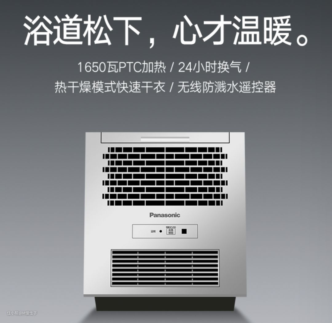 ▼而在千元内小机身产品方面,我推荐松下的FV-JDBJUSA,在30*30的安装尺寸内,做到了1650w的高加热功率,以及150³/h的大换风量,同样有冷热干燥以及无线遥控,并且价格做到了千元内,是小浴室的高性价比选择。