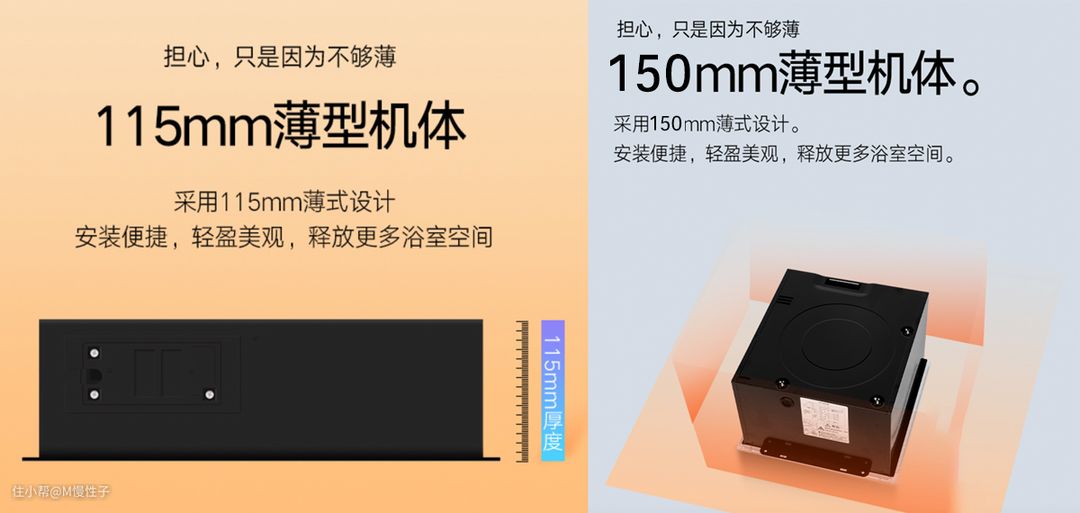 ▼更薄的厚度,对于我们的安装会带来一定的便利,特别是低层高的空间,薄型的设计则能让我们有限的层高得以节省,让我们的空间显得更宽敞。但要注意厚度也不能一味的做薄,比如市面上有一些把厚度做到10cm以下的,它的管路的宽度,内部的空间都会受到影响,进而影响到换风的效率以及噪音的控制,所以相对于30*60的产品最低厚度也应该在11cm以上,而30*30的产品也要在15cm以上。