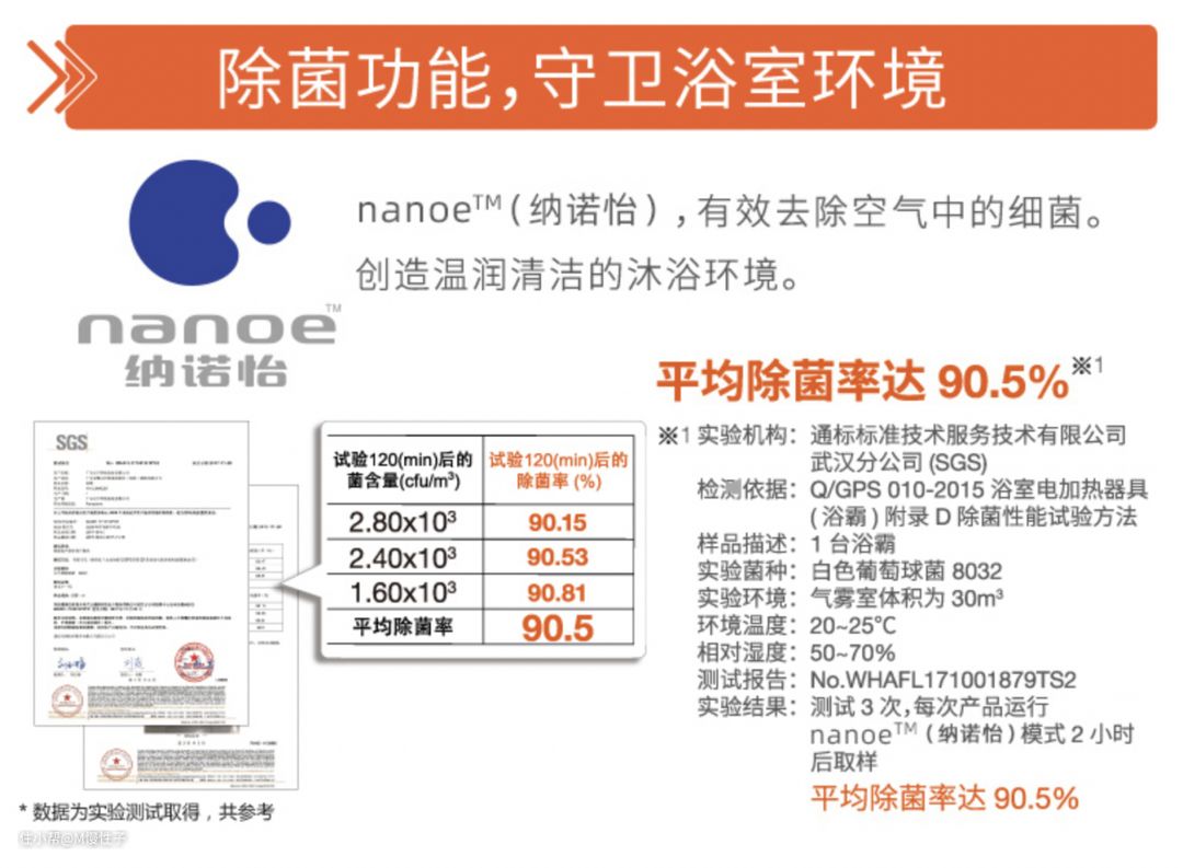 ▼而应用于浴霸方面,主要利用了它除菌的属性,在相对潮湿的浴室环境中,应用了纳诺怡技术的松下浴霸除菌率可以达到90%以上,而除菌功能是目前大多数浴霸都不具备的。