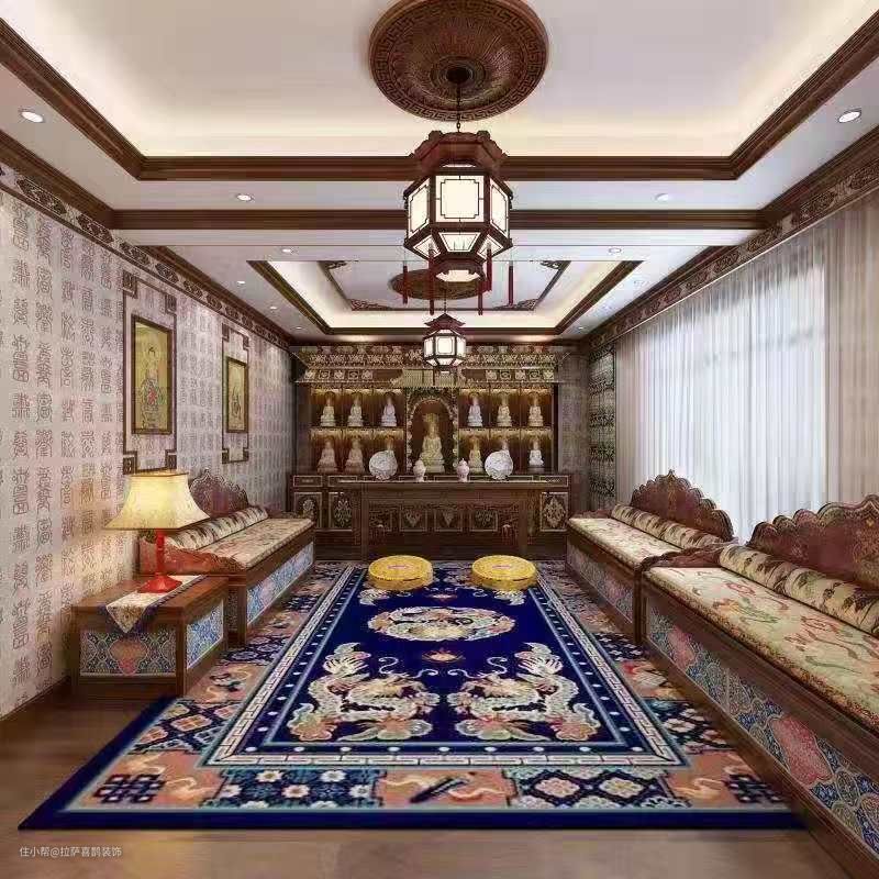一般来说我们藏族家庭在装修的时候,都会单独做佛堂,用于我们的日常参拜祈福,同时藏族的布艺装饰非常丰富,花色图案都精妙细微,并且基本上不重复,经常是以宗教为主题,也为他们的装修增添了许多神秘色彩。