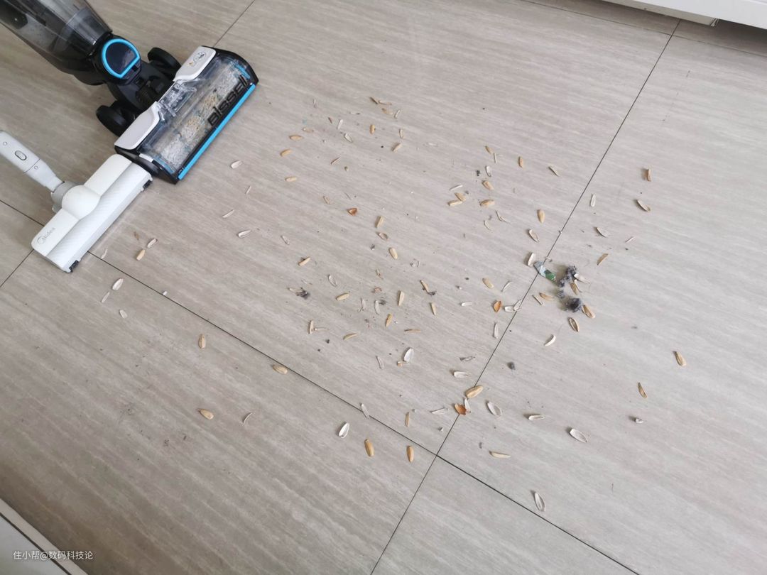 但强项在于干湿混合使用,特别是对于大理石地板、木地板的吸拖一体,见灰吸灰、见污清污能力,确实是强大到成王的地步。比如下面这种情况,地板上既有污渍也有瓜子皮等碎屑。