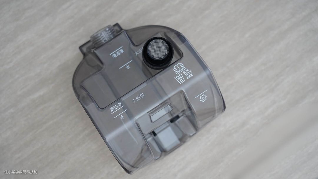 但与一般懒人拖把、洗地机不同的是,污水箱内在结构有点类似吸尘器的内在结构。上端有双层滤网,并带传感器可以检测污水箱是否满了。