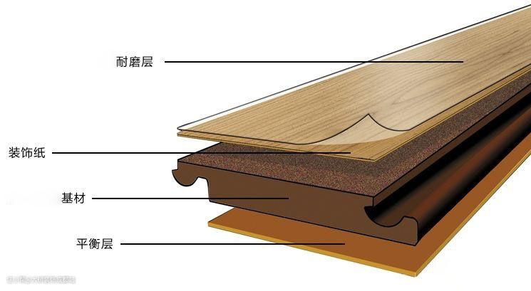 由上到下结构分别是:耐磨纸、装饰纸(花纹纸)、高密度基材、平衡(防潮)纸,都通过浸胶粘合。