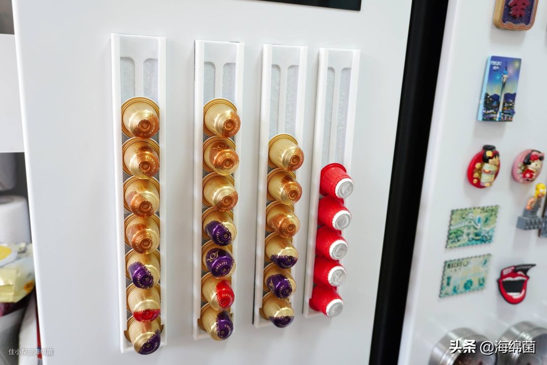 顺便推荐两个我觉得不错的磁吸附件,如果你和我一样是胶囊咖啡爱好者,这个磁吸的胶囊架很不错,不用每次开橱柜出门拿胶囊,也不用占用厨房台面摆放胶囊,直接冰箱上取就好了,相当方便。这款架子是3D打印的,马云家能找到,这里就不放链接了。