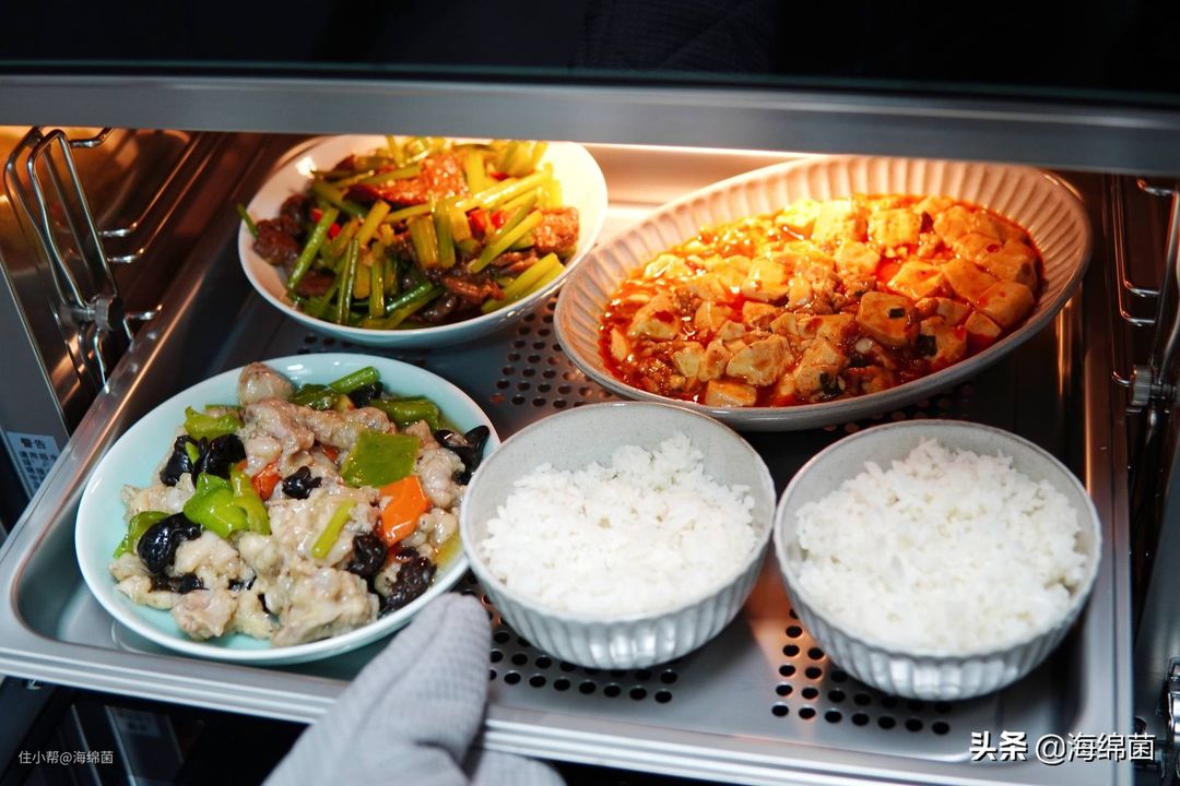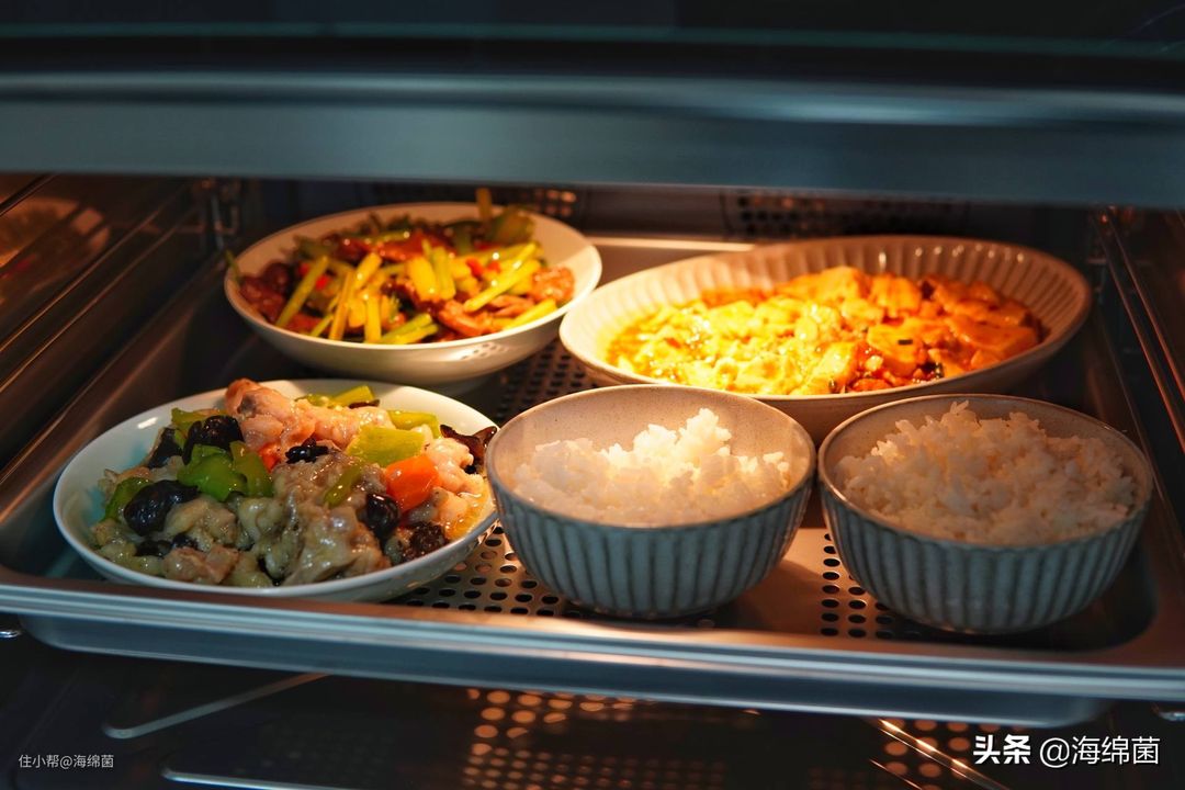 5分钟饭菜就热好了,可以看到因为蒸烤箱的烤盘足够大,一次3个菜两碗饭也没有问题,如果用微波炉加热的话,每个菜都要单独加热就麻烦多了。另外使用下来,我觉得蒸烤箱热饭菜的效果更好,毕竟有多组发热管从各个方向协同加热,比微波炉的热源来得更均匀,不会出现上面热底下凉的情况。