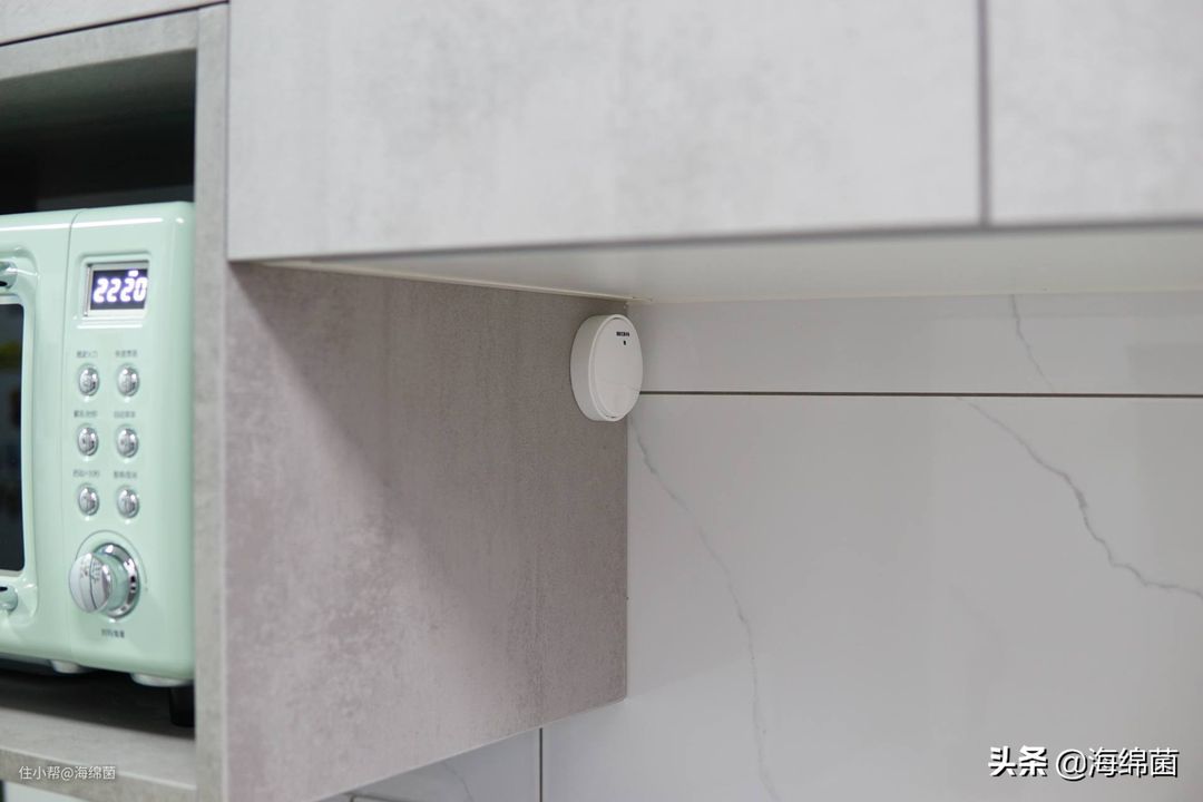 安装的位置和各位分享下,我觉得吊装微波炉相对比较科学,上柜下方可以做一个类似我这样的开放格,或者用支架直接固定在墙面上也可以,这样可以省下厨房台面空间,做立体布局,其他的小家电就能顺利摆放了。当然省力点的也可以微波炉架子,就是美观度上没有那么好。