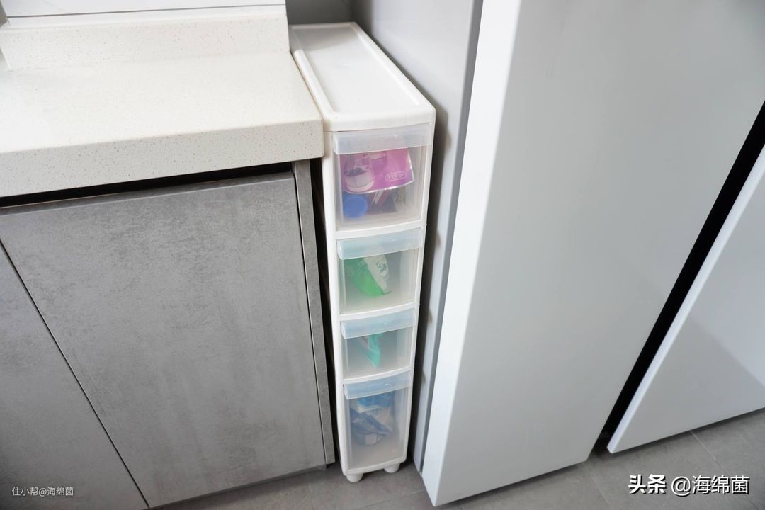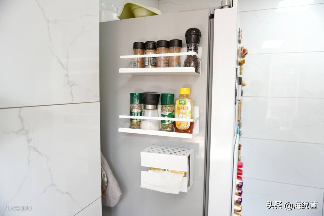另外是这种磁吸的调料架和纸巾盒,空间充分利用,金属材质白色喷漆和冰箱也挺搭配。不过需要注意的,背后的磁铁本身牢固度没有问题,但磁吸片和架子本身是靠不粘胶粘连的,建议买来后用万能胶重新粘一下,我是不会告诉你某天早晨起来看到地面上撒了一地的胡椒面的感受的。