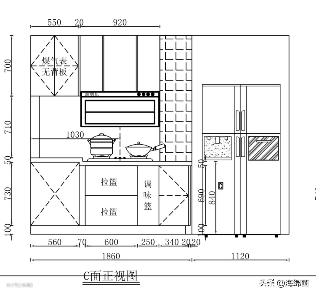 先来聊聊厨房的绝对大件:冰箱。就生活经验来说,冰箱能买大一点的尽量买大一点的,只要放得下,不管多大,你总能塞满的~相信我。不过当然也是要结合厨房的实际布局,下图是我的厨房一面的平面图,烟道的位置因为没法改动,所以旁边的位置就正好留给了冰箱,结合宽度和橱柜的深度,最后选择了西门子的502L的超薄款,型号是BCD-502W: