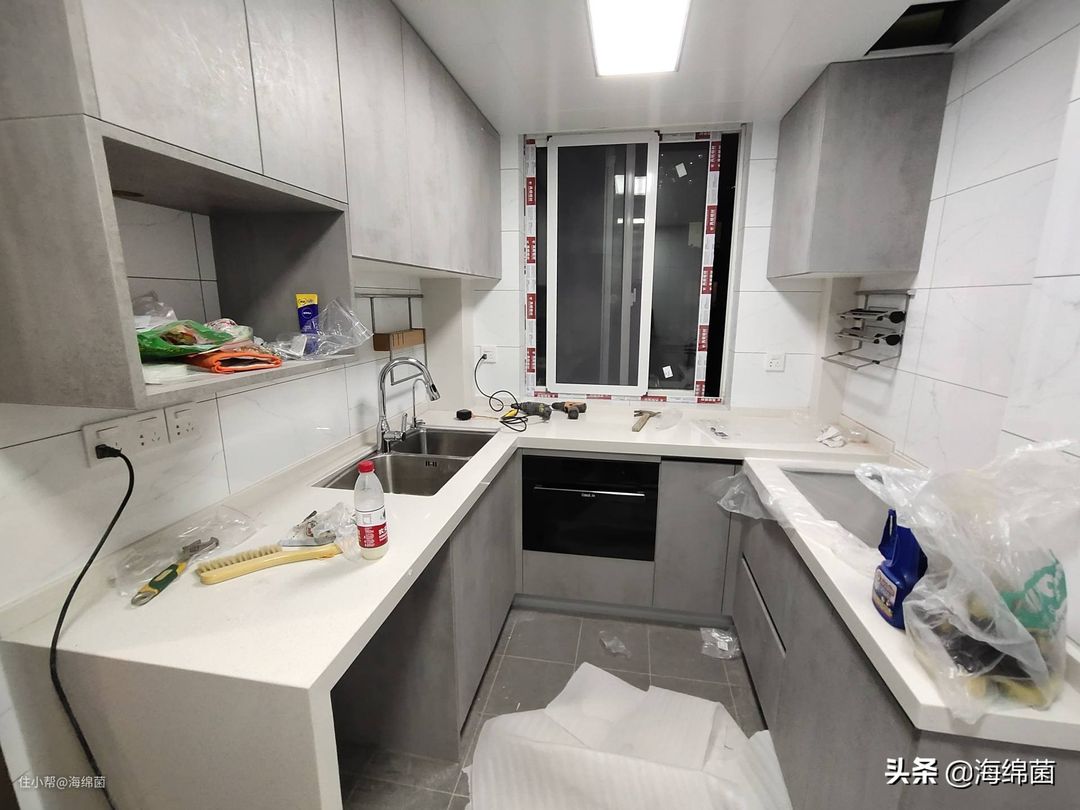 换个角度看下,因为U型厨房考虑到中间的过道宽度,我这边的橱柜实际做的只有55cm的深度,放入冰箱后可以看到还是会有部分凸起,但已经完全在可接受范围内了。