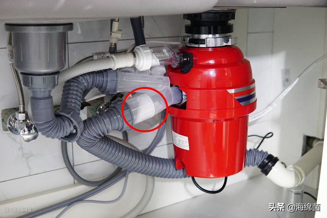 垃圾处理器堵塞的位置一般是下图打红圈处,这里有个单向的挡片,目的是防止下水道里的虫子回爬,我两次卡住的时候都是卡在这里。
