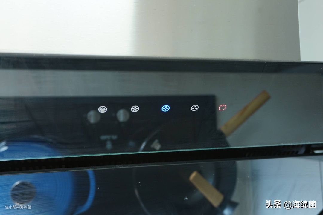 脱排油烟机同样也是黑晶面板的,也是一擦就干净,中间触控按键简单易用,大面板四维瞬吸,18m³/min大吸力,对付油烟没什么问题。