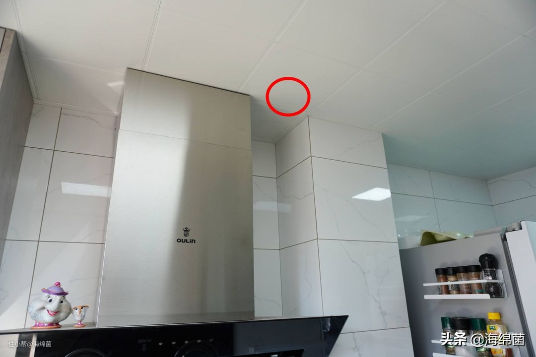 另外安装油烟机的时候,油烟机与公共烟道的连接处一定要做好密封,现在的油烟机内部一般都自带止逆阀,所以饭点的时候公共烟道油烟倒灌也没什么影响,但如果连接处密封不严的话,油烟就有机可乘了,连接处一般是在下图的红圈位置,吊顶的上方,这样不影响美观,所以在安装油烟机的时候,最好有人在场,这个部分做到位了,后期基本就没有反味的问题了。