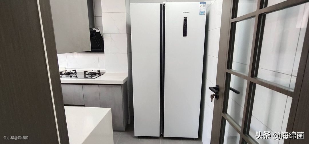 实际摆放效果如下,机器的颜值还是可以的,白色面板简单融入厨房环境,隐藏式门把手也挺美观的。冰箱的容量为502L。在双门冰箱里不算大的,变频压缩机,风冷无双,但最主要的还是看中了它纤薄的外观,因为厨房门正对冰箱,如果冰箱太厚重的话进门会很有压迫感。机器的高度为183.7cm,宽度为90.8cm,实际深度为63.6cm。