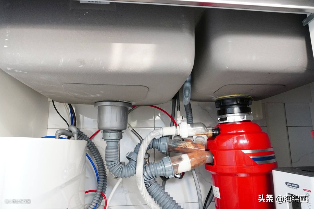 这样安装的原因是我的操作台在小槽的旁边,处理完食材之后脏东西直接往小槽里一推即可,设计台下盆也是考虑到这点,所以垃圾处理器一定更要装在这里才行,否则垃圾要越过小槽再扔到大槽里就很不方便。同时我的RO净水器也是需要放在左边的,所以安装时还是要仔细考虑自己的实际需求,也要结合水槽下方的空间规划,大小槽都是可以顺利安装的。