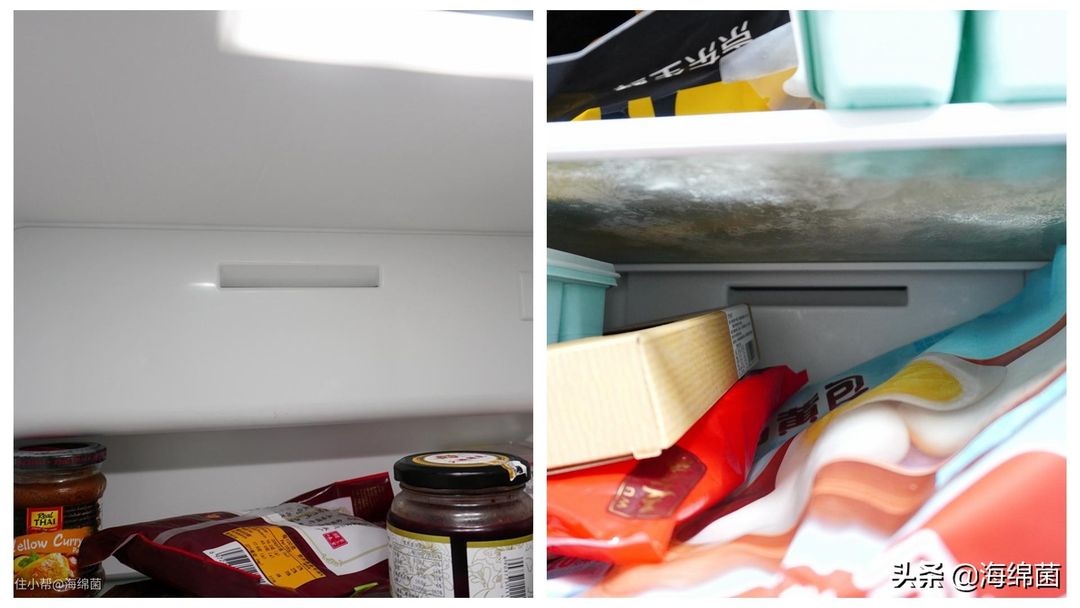 现在选择冰箱的时候,尽量还是选择风冷的,风冷无霜是现在的主流制冷方式,在冰箱的冷藏和冷冻区域能找到下图这样横向的口子,这里就是冰箱的冷气出风口,摆放食物的时候记得尽量不要堵住了。