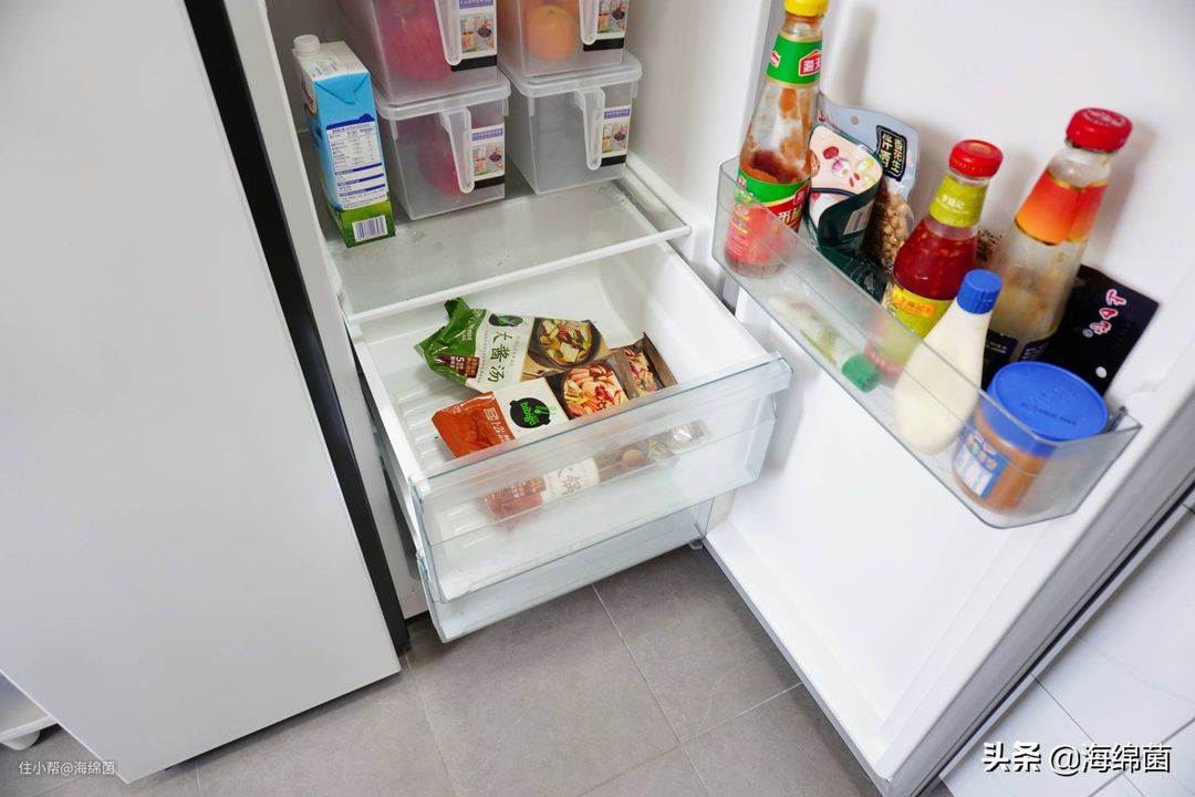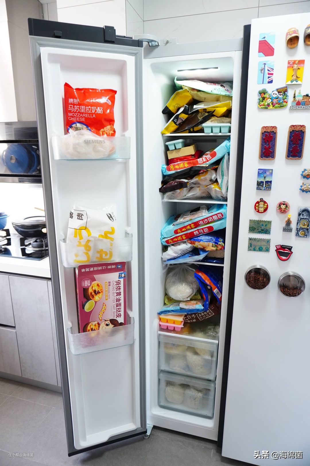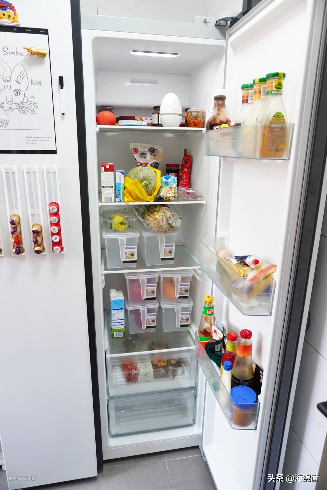 冷藏的稍大一点,容量为330L,我平时也就放放水果,鸡蛋调料什么的,因为饭餐都是当天清空的,所以冷藏其实很少有放满的时候,我倒是挺希望这款是左右对称设计的,这样冷冻区域可以大一点。
