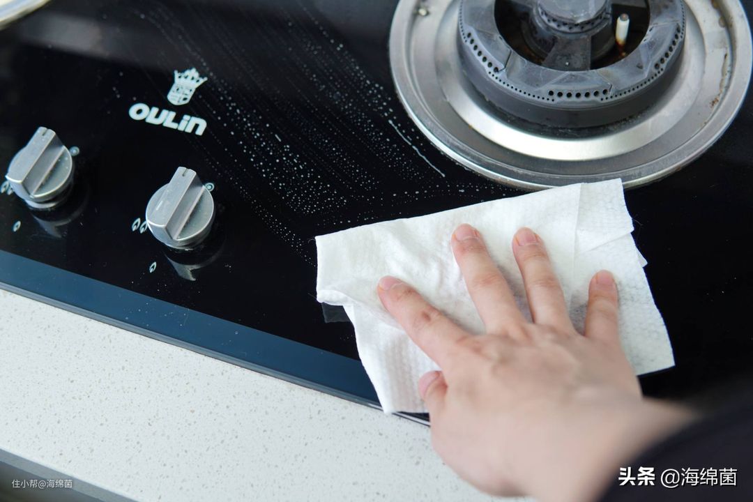 厨房湿巾是清洁玻璃台面的好帮手,轻轻一抹就干干净净了,每次我都使用一张,先把灶台旁边的瓷砖抹一遍,再抹一下灶台就搞定了。
