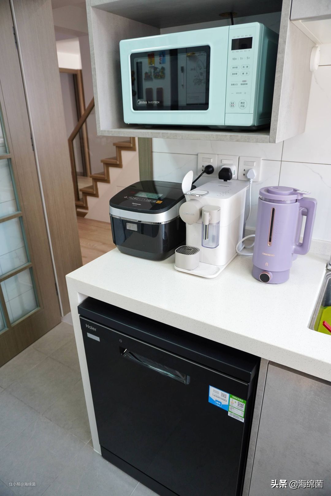 想必大家也注意到了我摆放洗碗机的方式比较特别,因为定做厨房橱柜的时候抬高了柜体,台面高88cm(为了切配和使用水槽轻松一点),使用台面的石英石直接把侧面一起给包掉了,实际效果还挺好看的。所以台面的下方就可以直接塞入独立式洗碗机了,一般的中式洗碗高度都没有问题,可能会有一点缝隙,然而看习惯就好了。