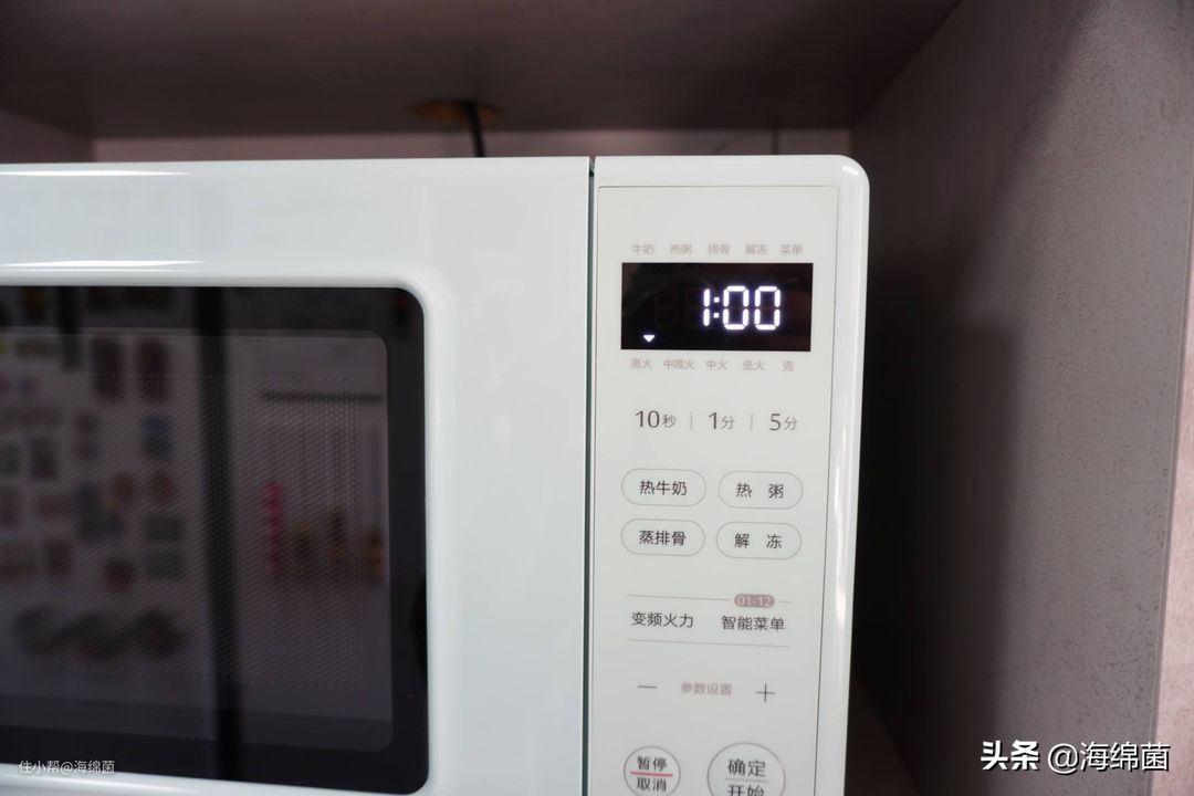 美的这款操作面板比较简单,按键都搭配了中文标注,上方有10s,1分,5分钟的快速启动键,上手非常简单,10s我有时会用来快速解冻黄油,1分热热冰牛奶刚好,5分钟还从来没用过,因为都用蒸烤箱代替了。