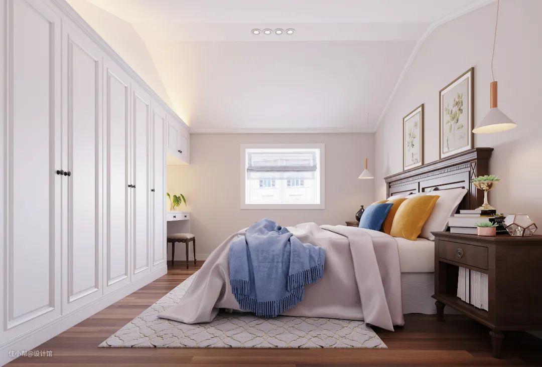 如果床侧边有空间放衣柜,然后床尾位置又较为宽裕的话,与其闲置、不如摆个斗柜在这个位置,斗柜本身就可以用来做一些日常小物品的收纳,然后柜台台面摆上花瓶、小饰品,还可以增加卧室空间的精致与温馨氛围。