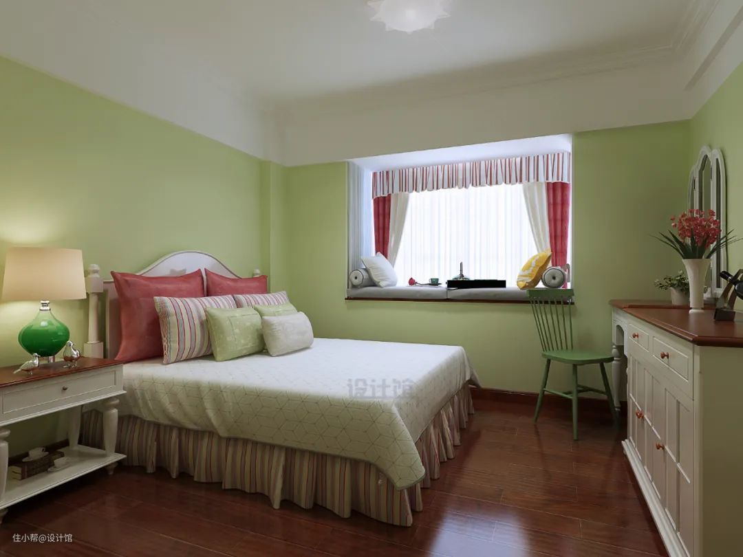 有些人会有在家工作加班的需要,然后家里又没有独立的书房,那么卧室床尾位置空间足够的话,也可以在这里摆一张书桌,这样平时看书、工作加班,都能有一个安静舒适的小角落。