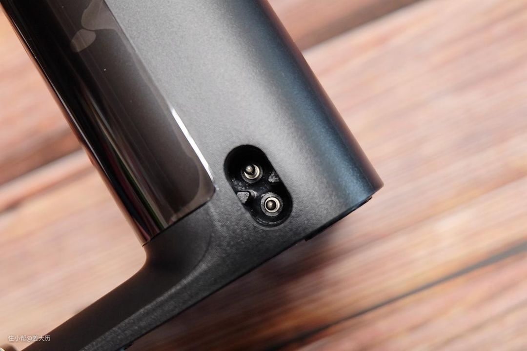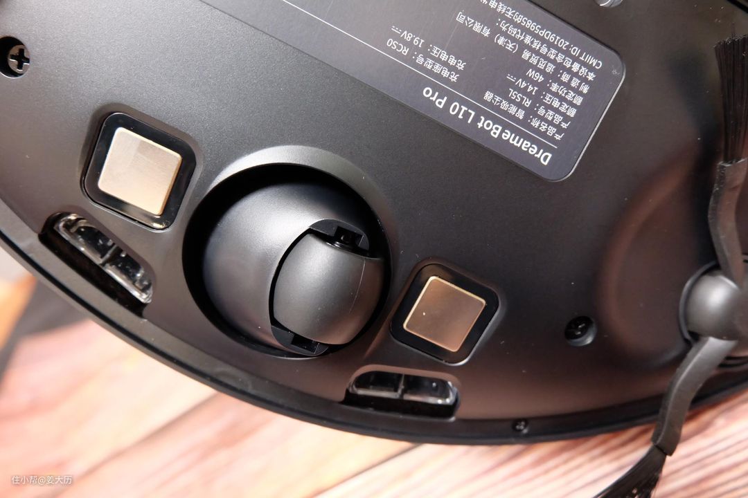 万向轮以及充电电极区域,万向轮灵活变动,能够轻松地带动整个扫地机避开障碍物。
