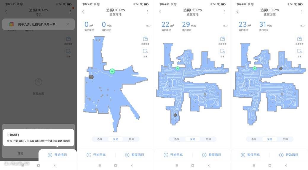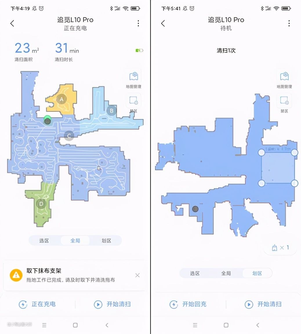 在经过清扫充电后,再次清扫,可以设置划区清扫了,针对某一个区域清扫,这样,很方便。也可以设置避开区域清扫(洗手间、厨房)比较脏的地方,可以先避开清洁,最后划区清扫。