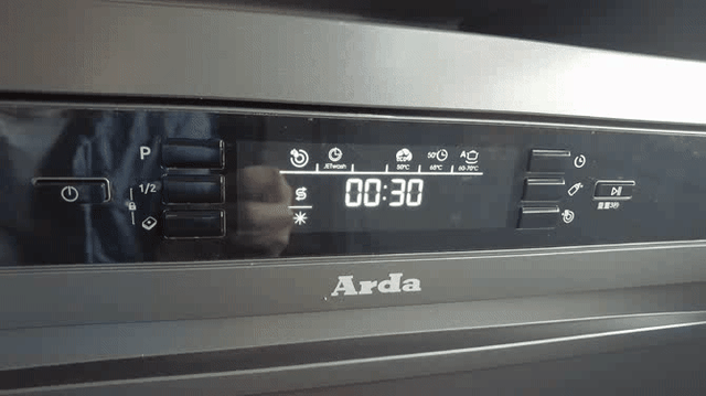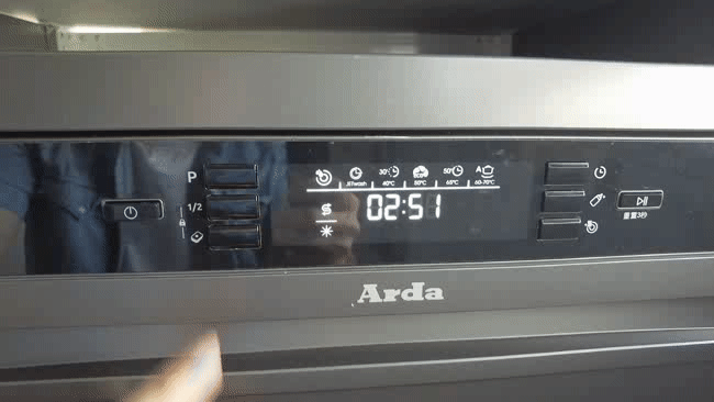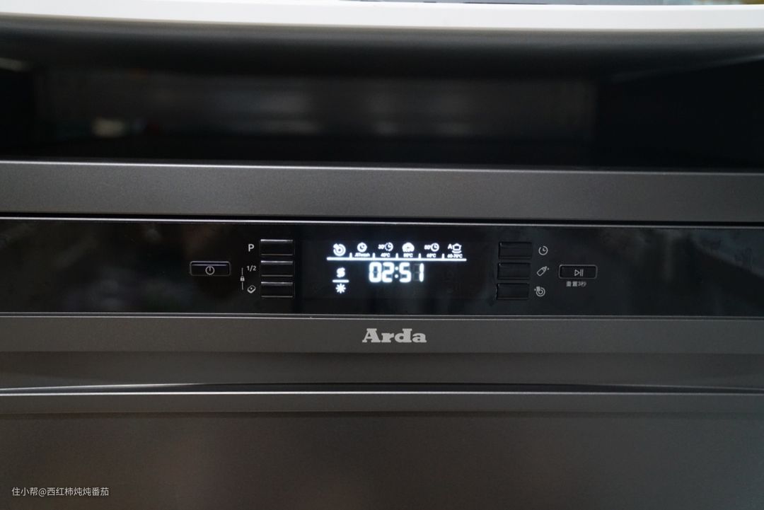 值得一提的是,这台 Arda洗碗机还拥有“半载洗”功能:通过短按表示有“1/2”的按钮,可以切换上层洗或者下层洗;当上下图标都亮起时,对比普通模式,可以用更低的能耗实现更少餐具的洗涤——相当于某固定模式下的节能洗 ▲