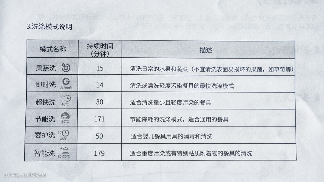 ④洗涤模式跟我们常见的国产洗碗机有较大不同,不同图标对应的含义需要简单学习适应后才能上手操作,这是这台机器的学习成本,不过逻辑还算简单,上手并不复杂;