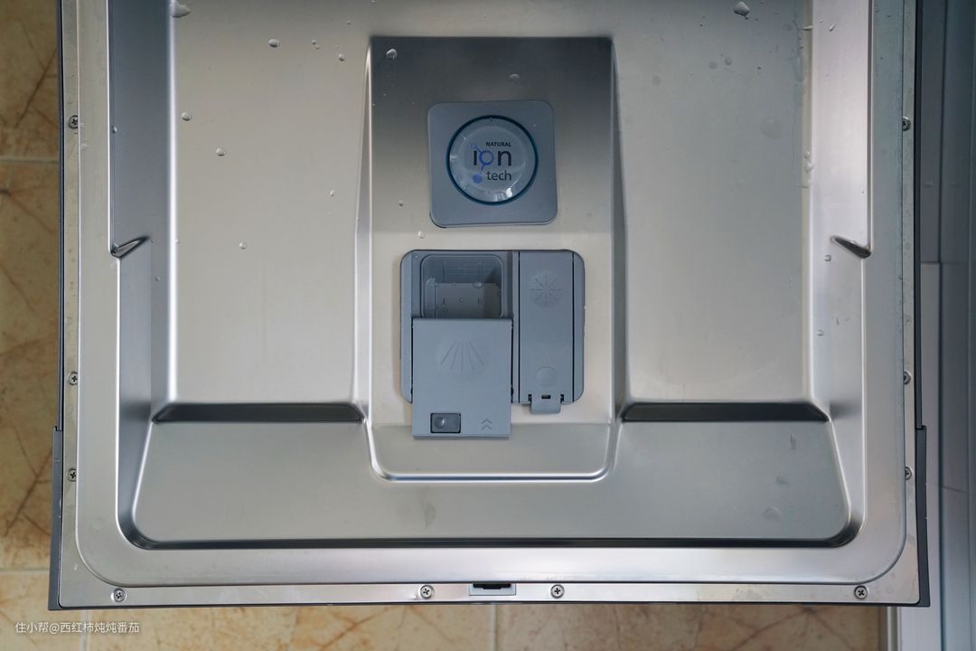 门板内侧除了洗碗粉添加口和漂洗剂加注口之外,还多了一个带“Natural Ion Tech”的装置。根据介绍,这是一个负离子发生器,主要作用是净味,方便洗碗机在关门状态下实现长期保存 ▲