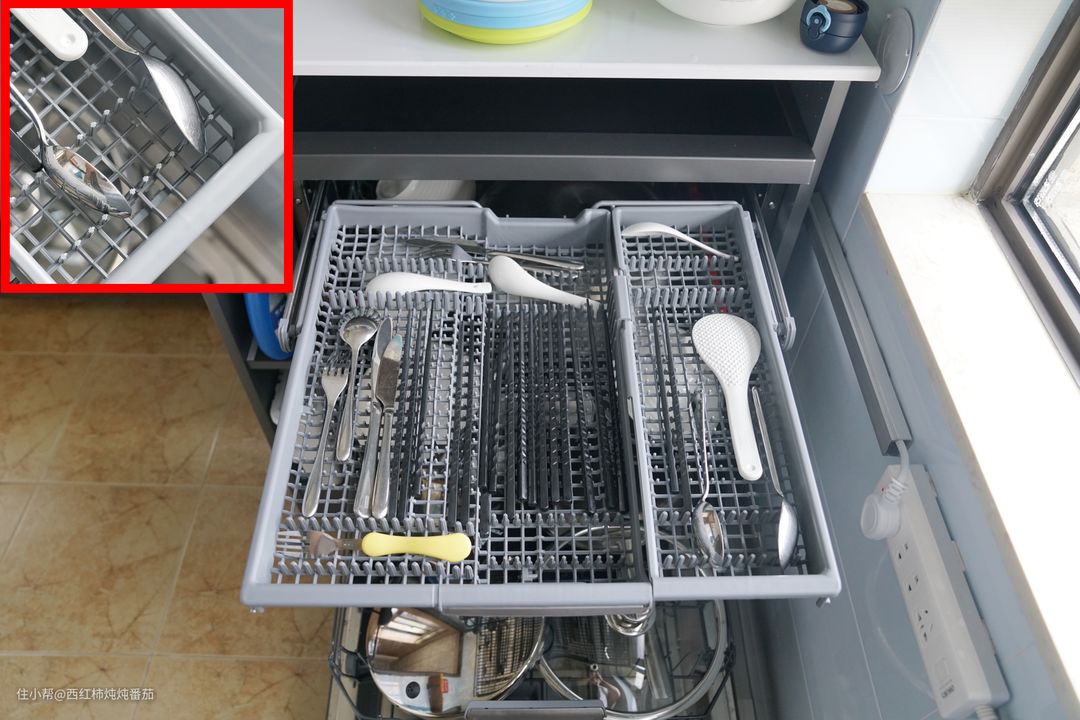 ②欧式尺寸带来的最直接优势,就是三层碗篮。最上层碗篮可以随意防止刀叉筷子甚至刀具、饭勺等小件餐厨用品,使用起来相当畅快自由;