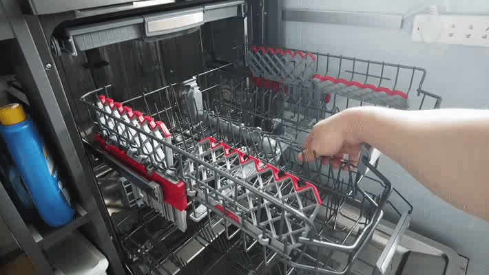这台 Arda洗碗机也有简单的应对办法:通过滑轨的快拆设计,我们可以将顶层筷篮快速卸下 ▲