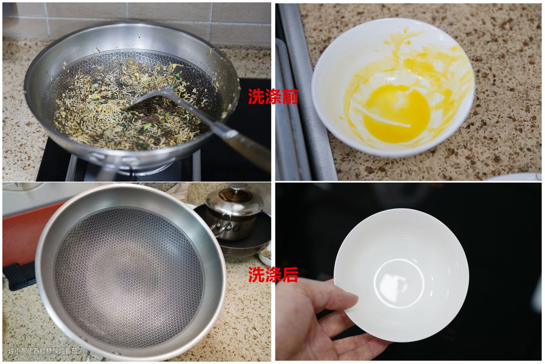 洗净测试都在机器默认的“节能洗”模式下进行,分别测试了对于半干状态蛋黄残留的清洁和对炒面后沾满面条的炒锅的清洁。从实际测试结果来看,洗净能力完全没有问题 ▲