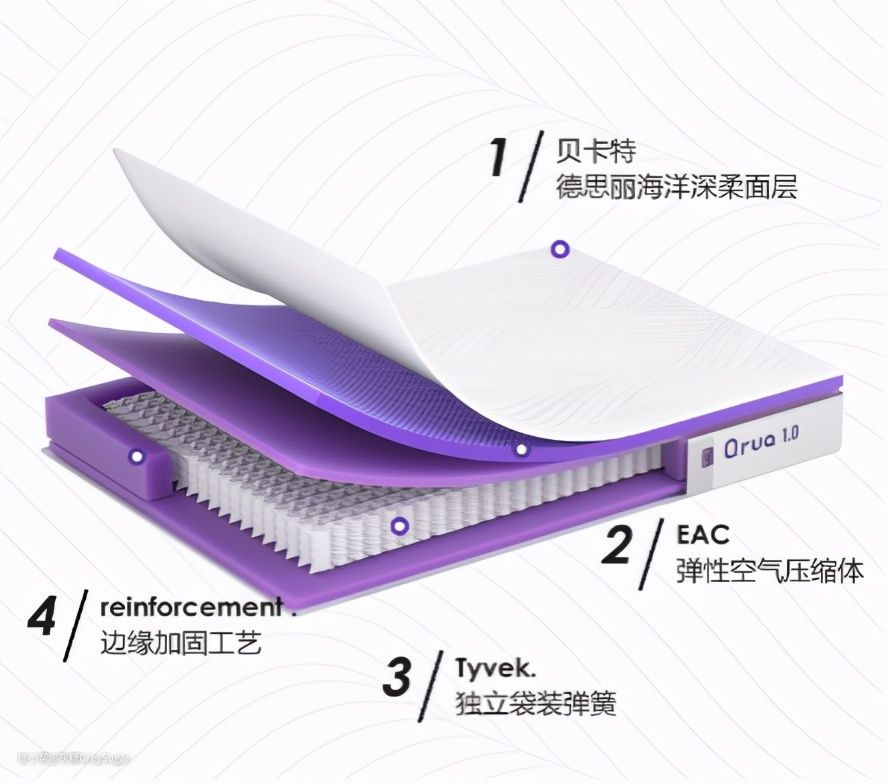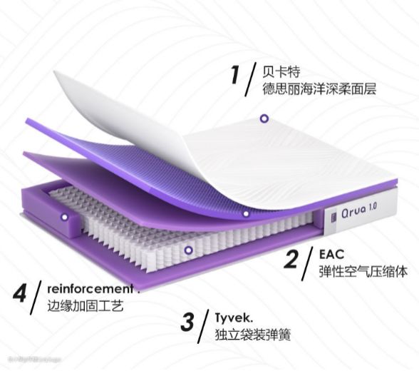 贝卡特针织面料+EAC无压网格+海绵+独立袋装弹簧弹簧+海绵围边,组成了整个“Qrua 无压网格床垫”,整个床垫非常重,用料十分的扎实,白色的外观大气耐看。