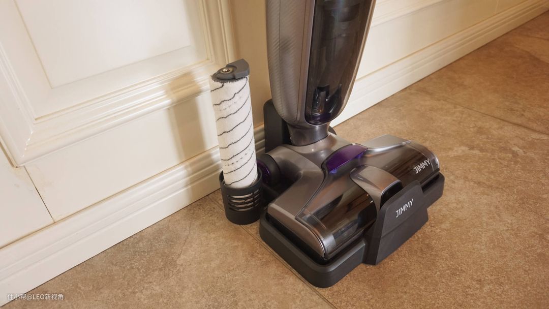吉米X8速干洗地机相比商超那种地面清洗机要小巧得多,大小和吸尘器差不多,但多了一个清