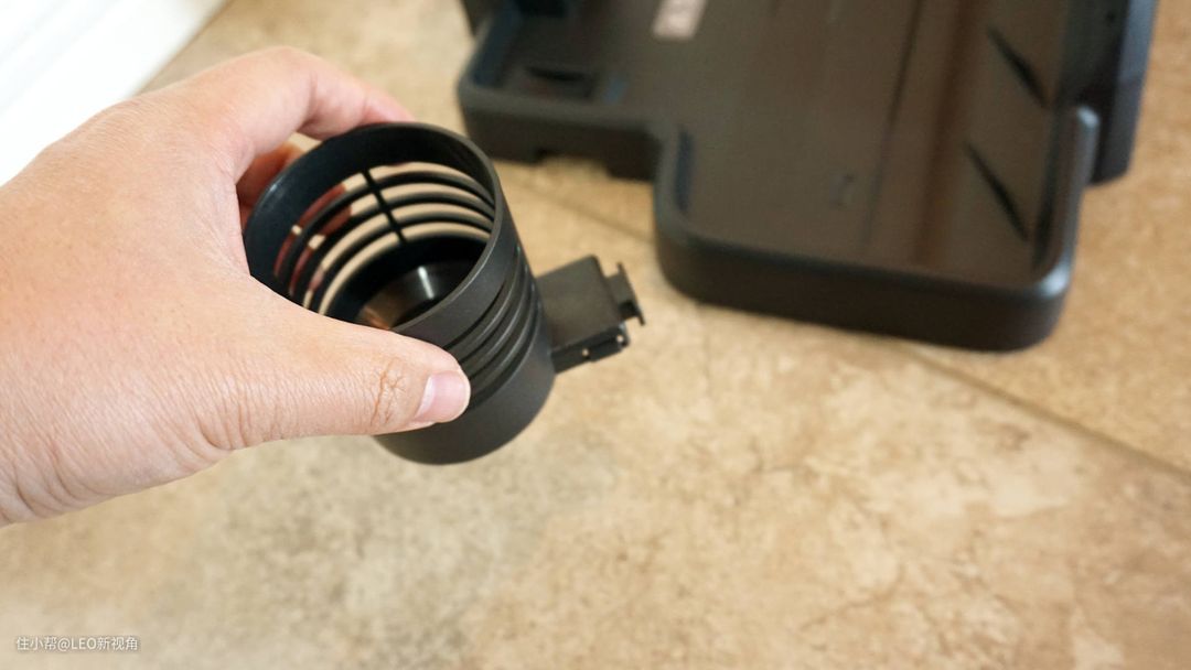 污水箱的拿取单手就可以操作,按压外拉就可以整个取下,方便后续地倾倒清理。而且可以看到污水箱的上方有一个滤网设计以及防止回流设计,无论是灰尘还是污水都被存储在这里。
