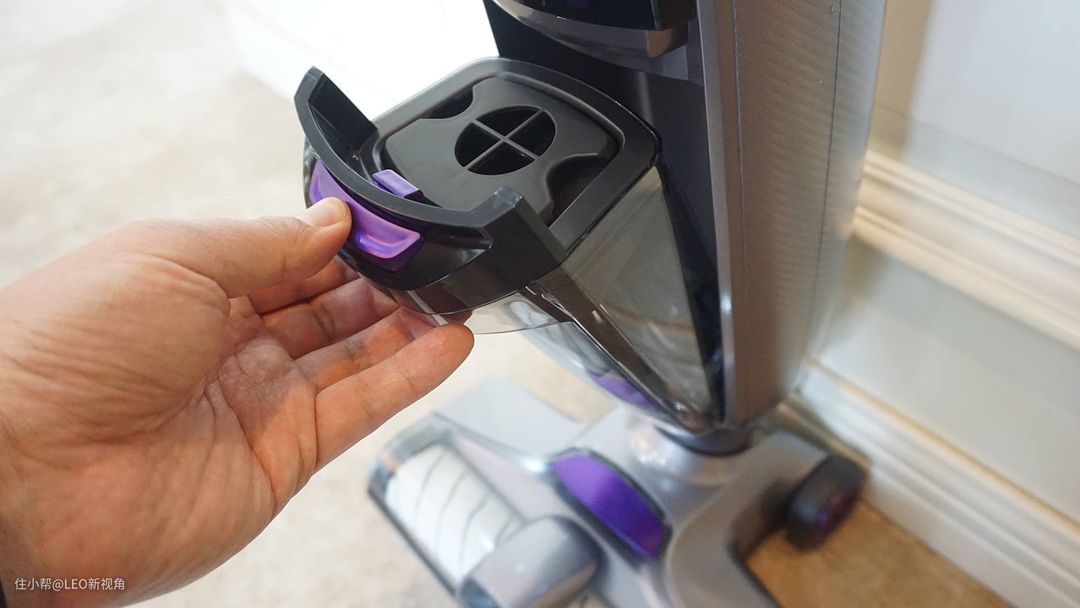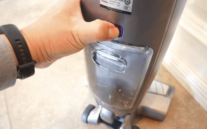 清水箱的拿取也是类似的设计,不过这个清水箱相对小很多,底部的盖子可以打开,灌满水拧上,再倒着放,密封性很好,不用担心水渗出。在清洁过程中,只有手柄按下喷水键,才会供水。