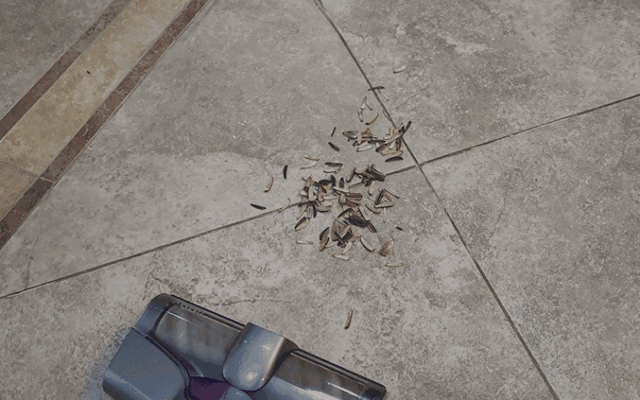 对于液体和毛发可行,那对于日常颗粒较大的垃圾,比如地上的瓜子壳是否可以像吸尘器一样被吸走呢,测试结果完全可行,没有一粒从滚筒中漏出来。