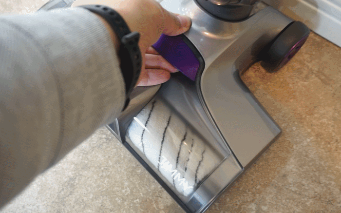 另外在充电底座上,还设计了一个滚筒刷的沥水晾干的架子,每次自清洁完成后,可以拆下滚筒刷晾干,保持干净方便下次清洁使用。