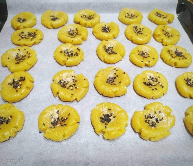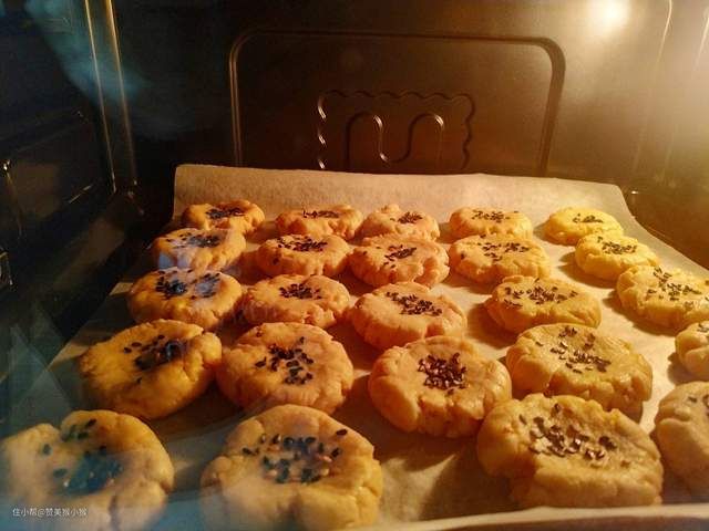 然后把面糊挤在烤盘油纸上,挤出一个个小饼干的样子,切记不可挤得太厚太大避免一次烤制大小不均匀烤糊或者烤不熟现象,尽量保证大小一致。最后选择烤箱的饼干模式进行烘烤即可,切记烤的时候尽量不要走开,多观察饼干上色的情况。