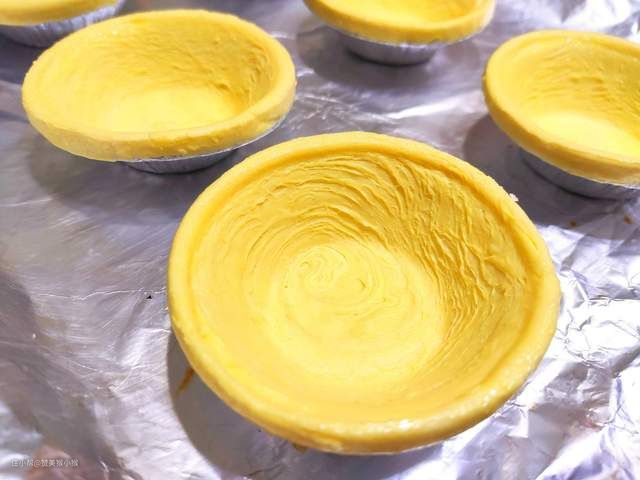 然后再把把锡纸或者油纸铺在烤盘上进行保护(也可以不铺),将蛋挞皮平铺在纸上,将蛋挞液均匀倒入蛋挞皮,八分满即可。然后将蛋挞放进烤箱的中层或下层。
