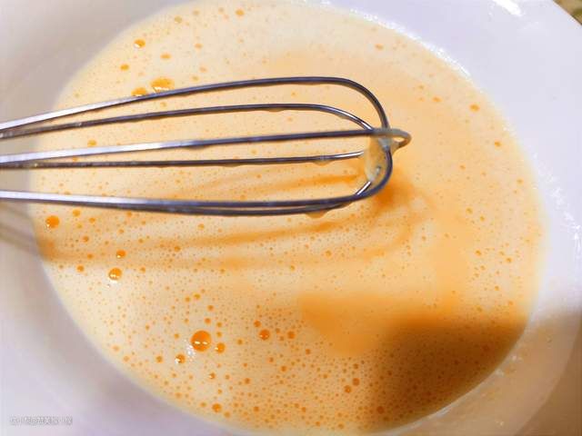 接下来首先制作蛋挞液。取大碗一只,加入白砂糖和鸡蛋液,用搅拌器均匀搅拌5分钟彻底打散鸡蛋,然后再加入鲜牛奶,继续不断搅匀,搅拌均匀后就可以准备使用了。至于蛋挞液是否需要过筛,我这里觉得差别不大。