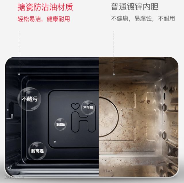 作为直接接触食物的内胆部分,目前市面上的内胆材质包括:镀锌板、镀铝锌板、镀铝板、不锈钢,以及搪瓷内胆等几种。其中镀锌板的材质最为低廉且长期使用后容易滋生细菌。而镀铝锌板则是200元左右烤箱产品的标配内胆,同样存在容易腐蚀和生锈的问题。清洁起来容易破坏表面的镀铝保护层。