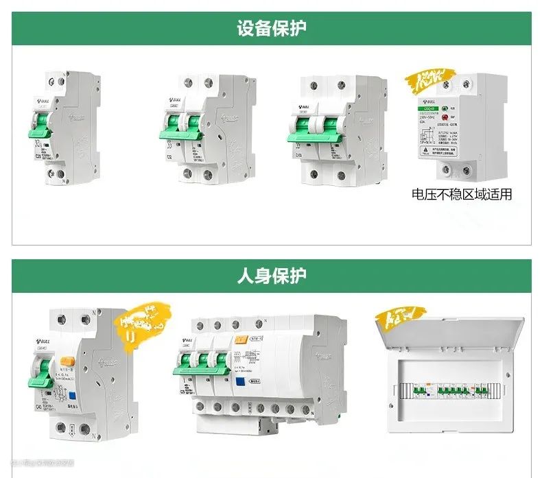 上图为空气开关、下图为漏电保护开关。漏电保护增加了保护漏电及触电时的触发,空气开关只会在过载时跳闸。这里建议大家在选择的时候尽量选用一些大品牌产品,虽然贵一点点,但质量有保障。