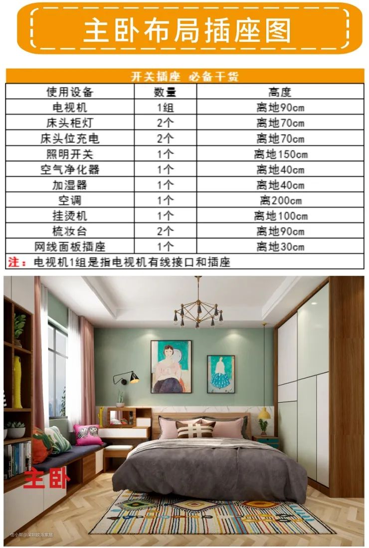 ③沙发两侧和床头,至少要留两个插座。一个给阅读灯或床头灯用,另一个给手机充电。有条件的话,记得装一个带USB的五孔插座。