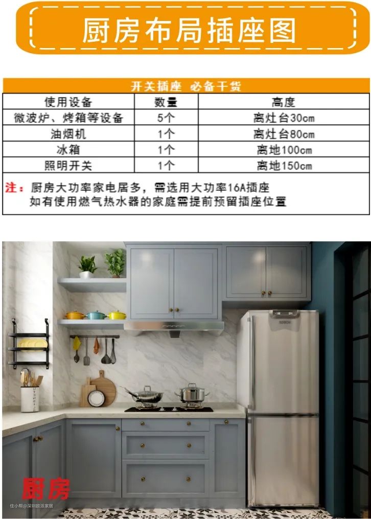 ④厨房小厨电区域,记得装带开关插座。用完随时关闭,避免用湿手接触插头。