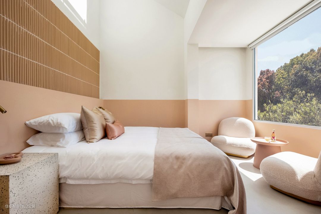 这是一家民俗设计,主题色粉色,粉色一直与梦幻少女心和ins风紧密相连,而这与业主的个性和对民宿的定位有差异。但设计师通过硬朗的材质和大体块的造型去中和桃粉色的甜腻相结合,在空间上,采用大量的半弧形造型,弱化室内的边界,增加空间的趣味性;也有多处直线条的垂直元素,突出利落的阵列感,与柔软的主色调形成反差萌。