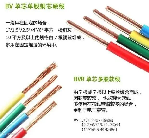 除了电线的“粗细”之外,电线还有“软硬”之分:硬的叫BV线,软的叫BVR线,区别看下图:
