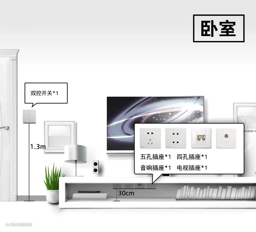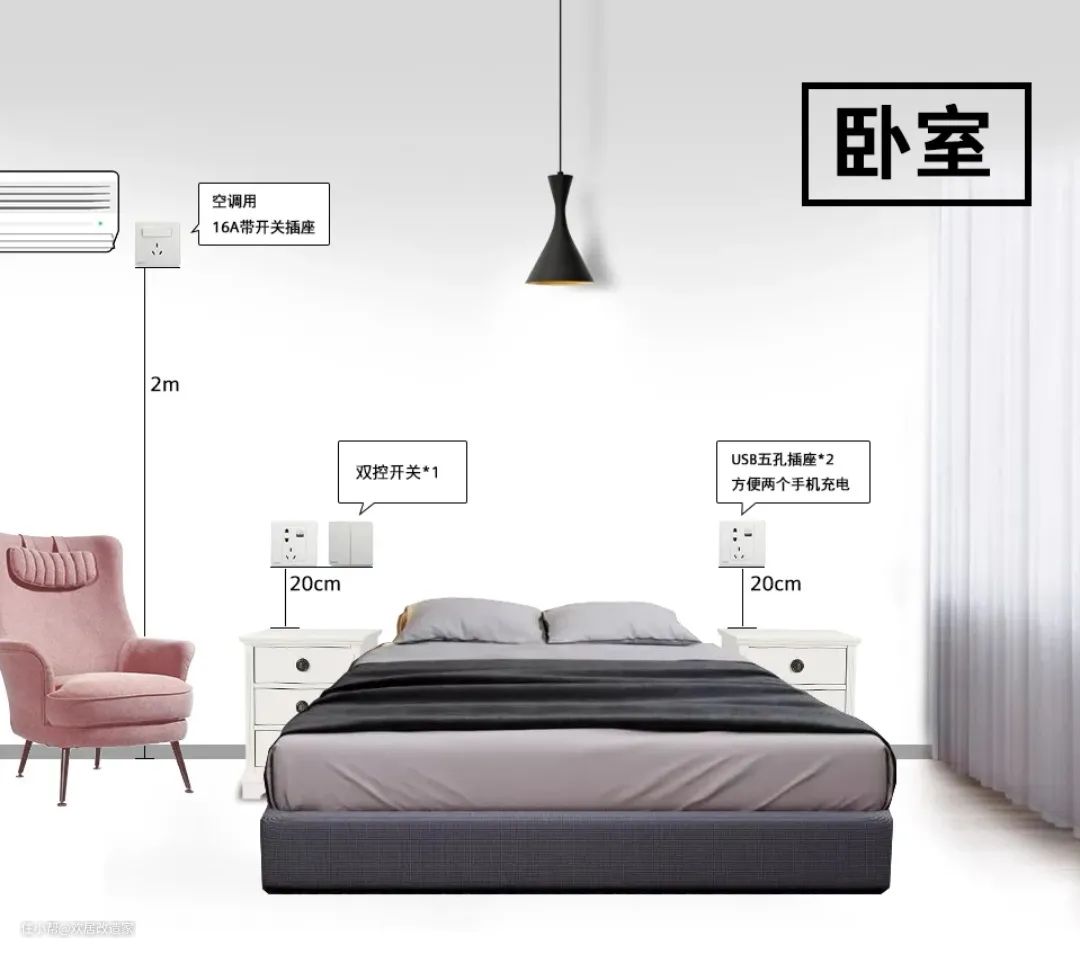 最后记得卧室高处留一个带开关的16A插座,供空调使用。
